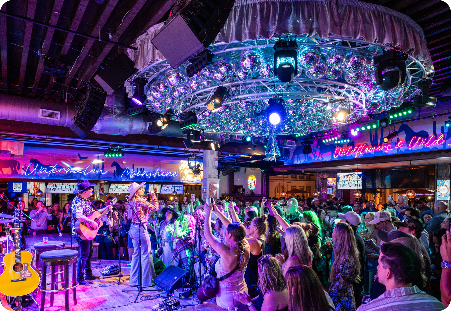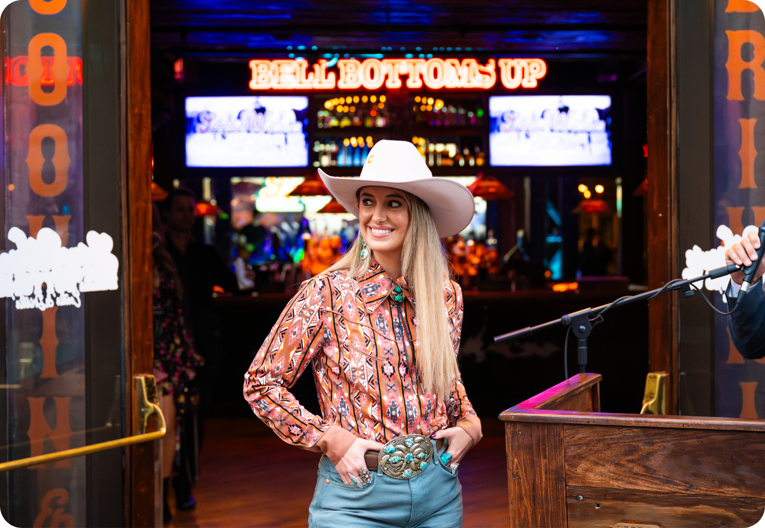 Bell Bottoms Up is a tribute to Lainey’s journey and the rich culture of Louisiana, all set in the heart of Nashville. Every inch of the venue tells a story, from the cowgirl hat chandeliers to the retro-glam rooftop. With three levels of live music, a champagne lounge, and a basement-level Bayou Keys, it’s a place where every night feels like a celebration.